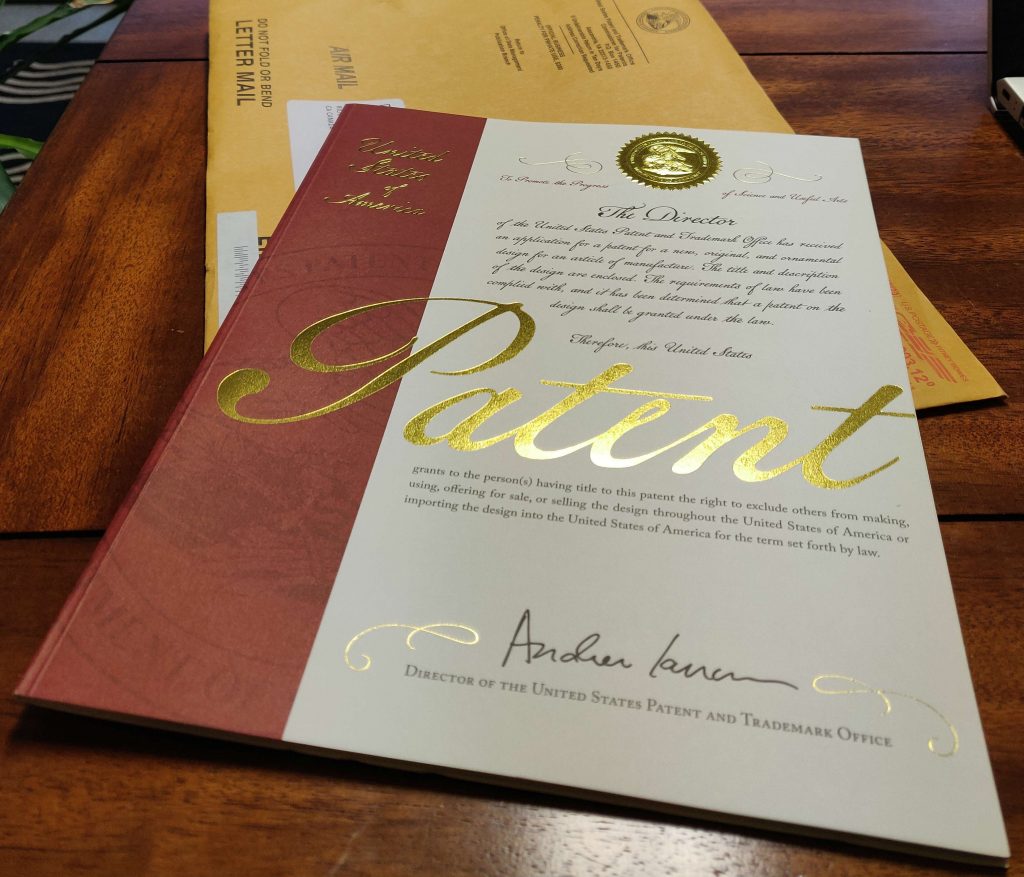 This makes the total number of issued design patents to 3 (2x USPTO, 1x CIPO),  4 pending design patents , and 1 pending utility patent.